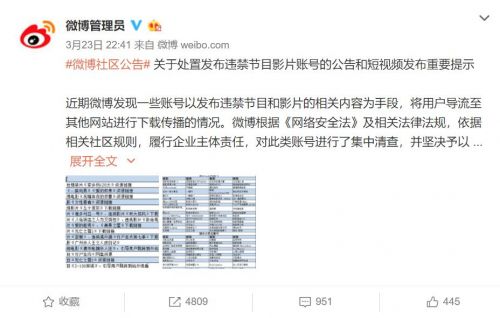 近期微博发现一些账号以发布违禁节目和影片的相关内容为手段,将用户导流至其他网站进行下载传播的情况。微博根据《网络安全法》及相关法律法规,依据相关社区规则,履行企业主体责任,对此类账号进行了集中清查,并坚决予以关闭。