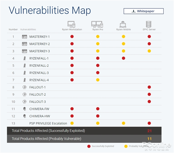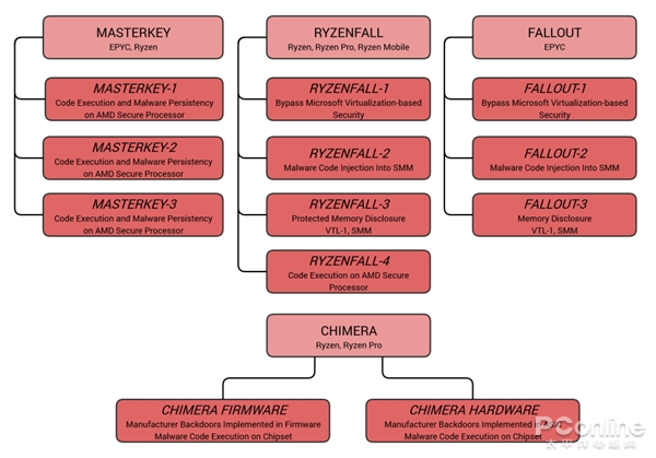 AMD初步将漏洞划分为三类,分别是“Masterkey”、“RyzenFall/Fallout”和“Chimera”,前两者涉及安全芯片,后者则涉及芯片组。