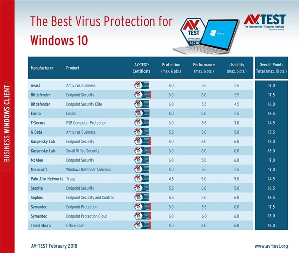 AV-TEST公布了2018年1~2月杀毒软件的最新测试情况,稍稍有点不接地气的是,基于Windows 10企业版平台。排名第一的依然是铁打的卡巴斯基,3个满分总计18分无悬念。不过,这次Symantec和Trend Micro也是18满分,令人刮目相看。
