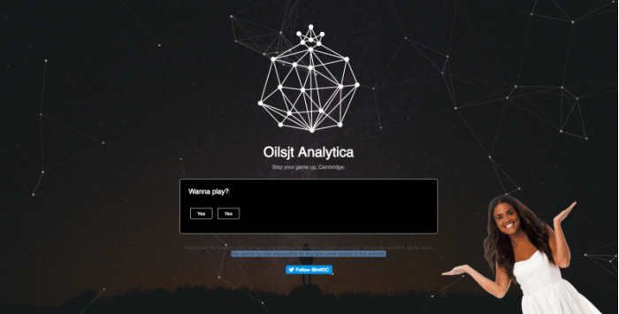 来自比利时的道德黑客Inti de Ceukelaire又回来了。 De Ceukelaire建立了一个工具,可以在回答他的新网站“Oilsjt Analytica”中15个问题之后,非常可靠地告诉您是谁,这是对Cambridge Analytica最近Facebook丑闻的嘲笑。