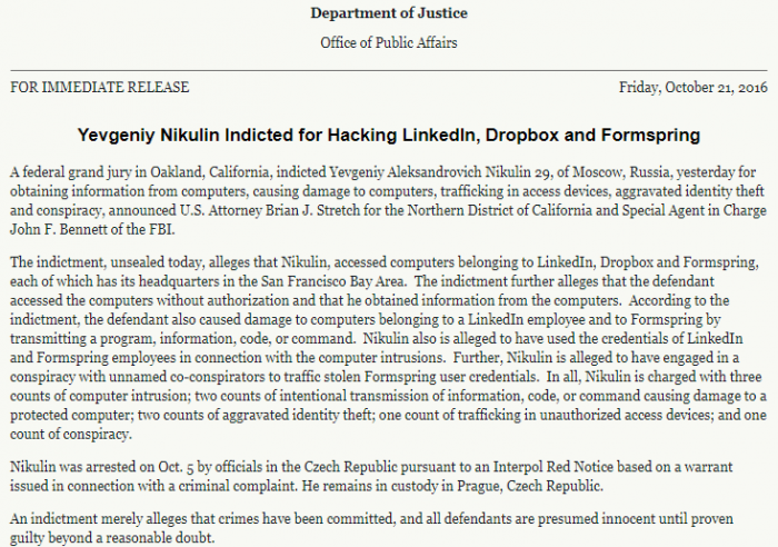 LinkedIn在一份声明中表示:“我们一直在积极追踪FBI的案件进展情况,追究那些需要对2012年盗取LinkedIn会员资料负责的人。我们很高兴看到这一进展,并感谢执法部门为解决这起案件所付出的艰辛努力。”