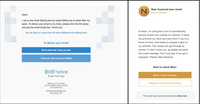 区块链初创公司BitBounce也已经为用户提供了类似的服务,然而其跟Earn.com以及其他竞争者最大的不同就在于它允许用户使用它自己的加密货币Credo代币。一封邮件的默认价格是0.05美元,其中70%将归用户所有,如果用户愿意可以将提成降低或提高。