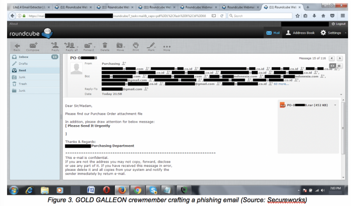 根据SecureWorks的调查结果,Gold Galleon通过收集公开可用的联系信息(例如公司的网站)以及利用营销工具 BoxxerMail 或电子邮件提取器来从公司网站上获取电子邮件地址,进而识别目标攻击对象。