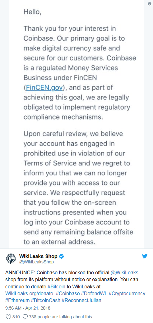 不过Coinbase的这一举动并不意味着Wikileaks Shop就不能再通过加密货币的方式展开交易,只是说不能再使用Coinbase这个支付渠道。不过此举却激怒了维基解密及其支持者。维基解密官推呼吁用户在下周展开一个抵制该交易所的运动。《Mastering Bitcoin and Internet of Money》的作者Andreas Antonopoulos则表示这是一个特别具有讽刺意味的举动:比特币自己是在Paypal、Visa、Mastercard在2010年切断该网站捐赠通道时获得了增长。Antonopoulos指出,考虑到Wikileaks Shop在Coinbase之外还有许多交易通道所以这次的动作并不会给这个网站带来太大的影响。