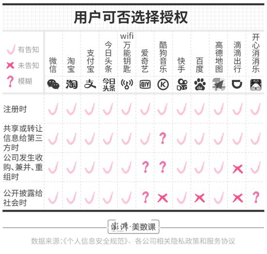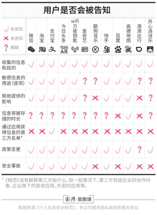 在应该告知用户的内容方面,第三方授权名单的公布是重灾区。《规范》指出,在第三方通过应用获得用户个人信息后,用户可以在该应用上查找到相关第三方的身份或类型。但在12款应用中,除支付宝提到查找被授权第三方的流程外,其余产品均无相关表述。