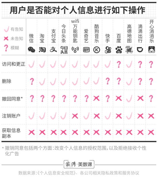 同时,撤回同意的相关条例也不太全面。按照《规范》,撤回同意包括两个方面,改变授权范围和拒绝接收个性化广告。除酷狗音乐、滴滴出行和百度完全没提到这项权利外,其他9款应用都仅提到了其中的一个方面,或疏漏了具体操作方法。