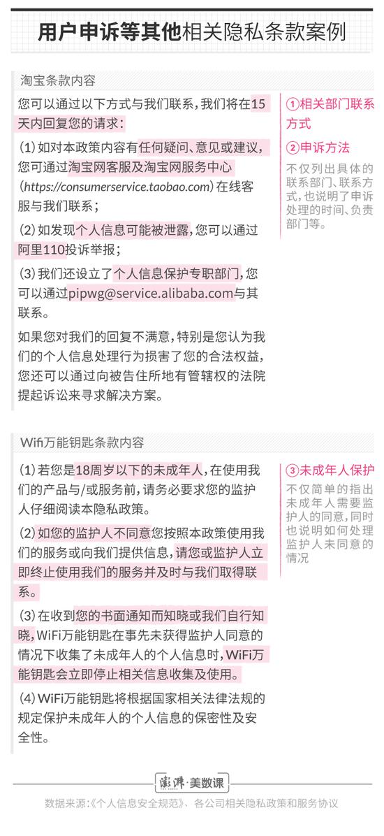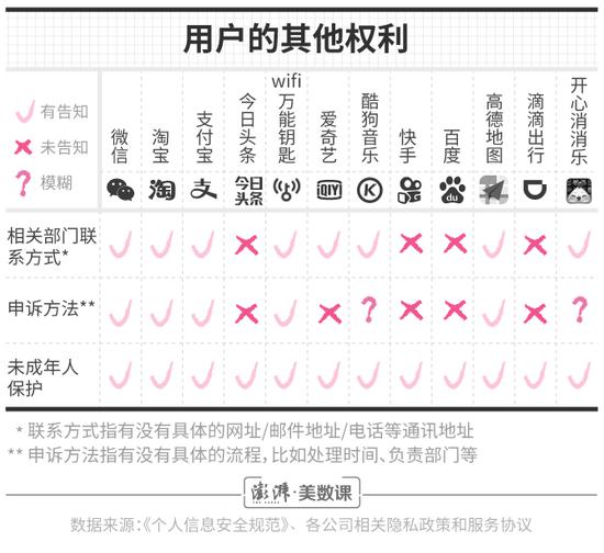 申诉方法是各应用隐私政策中容易被忽视的一点。12款应用中,有些政策或完全没提到申诉,或没有提供任何具体的操作信息。《规范》指出,企业应向用户提供隐私相关的申诉方法,包括时间周期、联系方式、费用相关等。