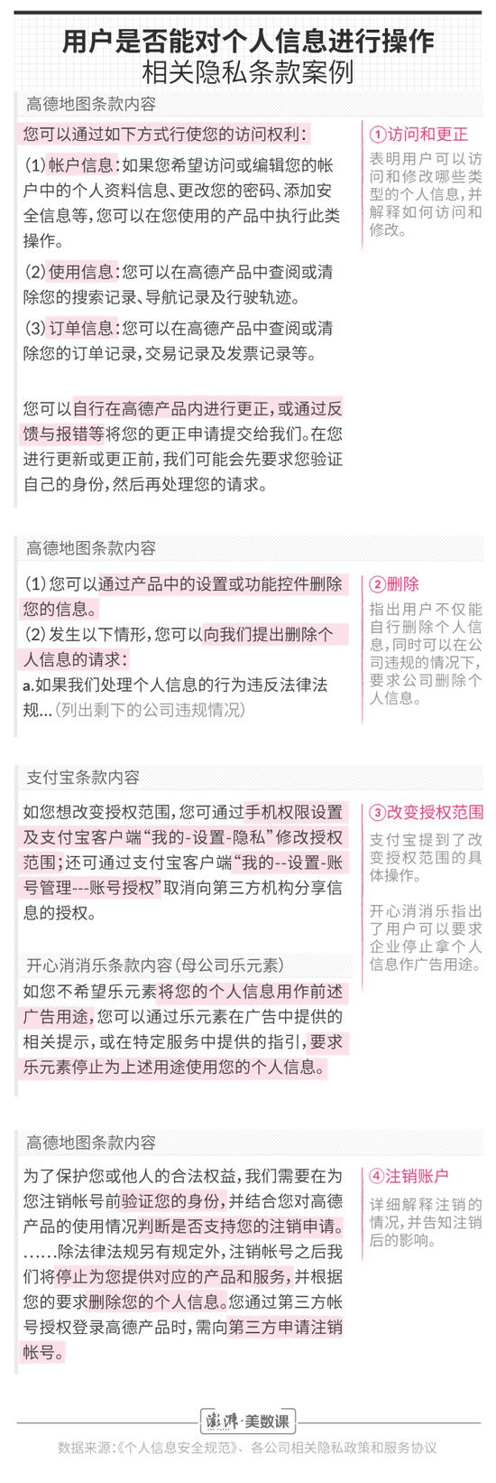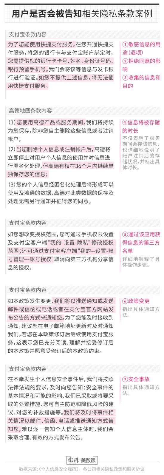 我们常用手机App的现有隐私条款,是否符合标准呢?澎湃新闻进行了测评:基于“隐私政策应公开发布且易于访问”的原则,澎湃新闻在12款常见手机App(注①)的官网上找到了相关条款,并对照《规范》进行分析:阿里系手机应用的隐私条款最周全,不过仍存在部分漏洞;个别隐私权利,如获取信息副本,基本被所有应用的隐私政策所遗漏或模糊化处理。