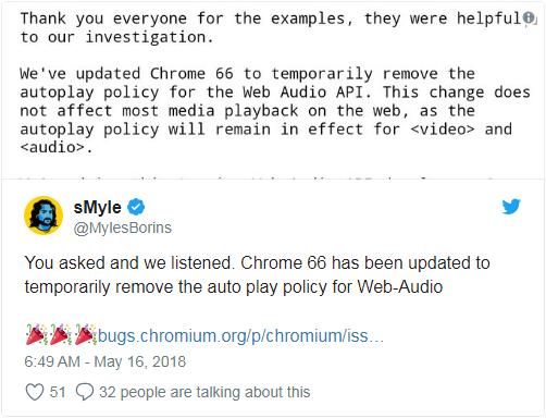 作为补救措施,Google 并未彻底回滚 Chrome 66 中屏蔽自动播放元素的功能,而是限制应用开发者使用的 Web Audio API、同时保持普通音视频自动播放的完整性。