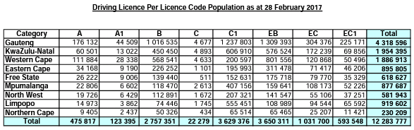 南非 eNATIS 驾照人数统计(2017 年 3 月)