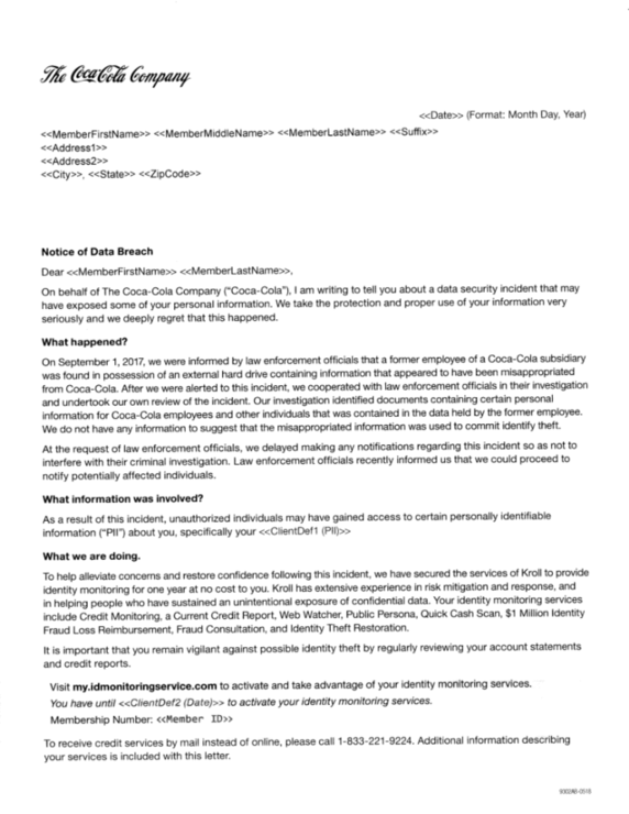 目前,可口可乐正通过第三方供应商向受影响的员工提供一年的免费身份监测。