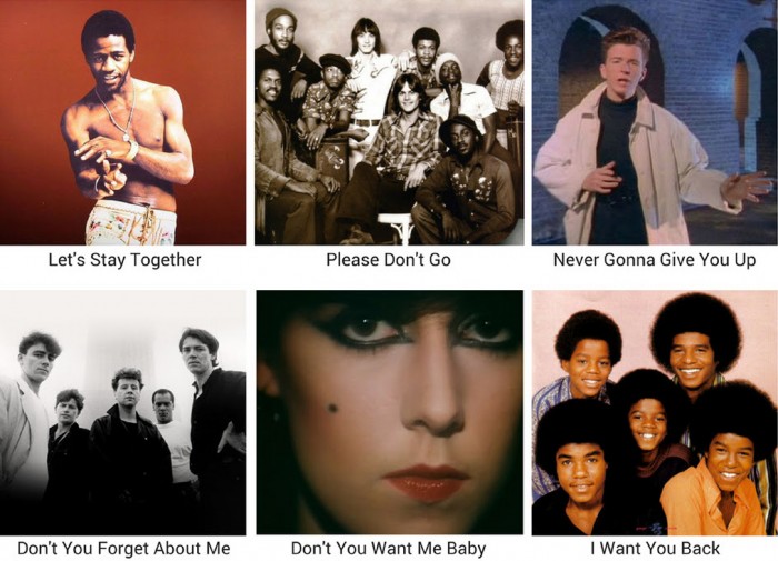 Alpha Kilo 使用 Michael、Al、KCs 和 The Sunshine 乐队等流行歌手的形象和他们的歌曲标题作为拼贴画,向用户表达心声:「让我们在一起」(Let’s Stay Together)、「别走」(Please Don’t Go)、「永远不会放弃你」(Never Gonna Give You Up)。