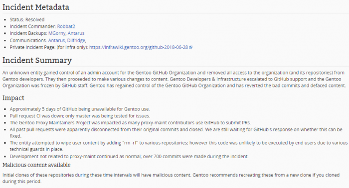 6 月 28 日 Gentoo Linux 项目在 GitHub 上的账号遭到入侵,攻击者随后对 Gentoo 的代码进行大肆修改,包括恶意在构建脚本 ebuild 里加入 rm -rf /* 命令。现在,Gentoo 项目公布了详细的事故调查报告: