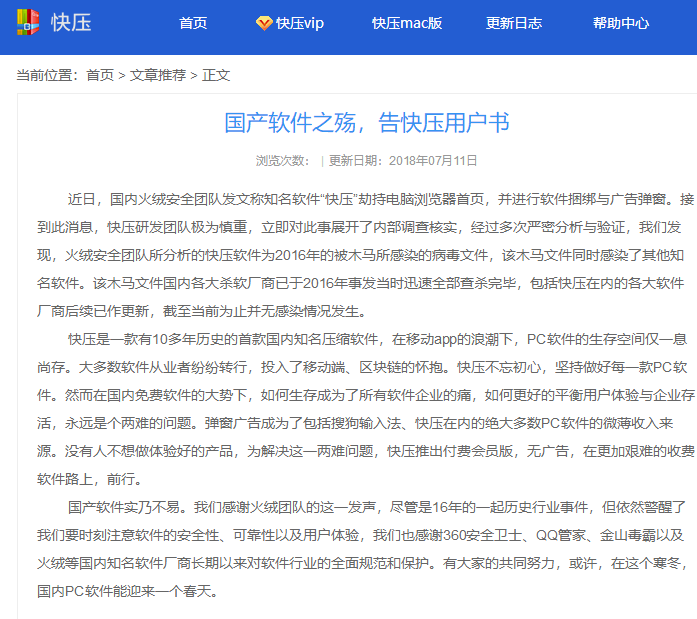 昨日火绒安全团队发文曝光知名软件“快压”劫持电脑浏览器首页,并进行软件捆绑与广告弹窗,并贴出了详尽的技术分析报告。快压团队今日对此回应称其分析的软件为2016年被木马所感染的病毒文件,并表示国产免费软件生存不易,弹窗广告是微薄的收入来源,以下是快压回应全文: