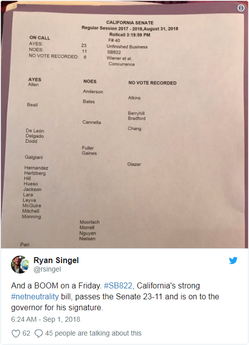 不过由于该法案在随后几个月内发生了一些改动,所以今日又被‘退回原籍’进行最终审核,电子前沿基金会(EFF)称之为‘黄金标准’的网络中立法案。