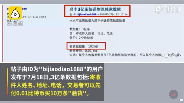 按照这位用户的表述,这些数据包括顺丰快递寄件人、收件人的姓名、地址、电话等个人信息,交易可以选择先“验货”,验货数据量为10万条,验货费用0.01个比特币。
