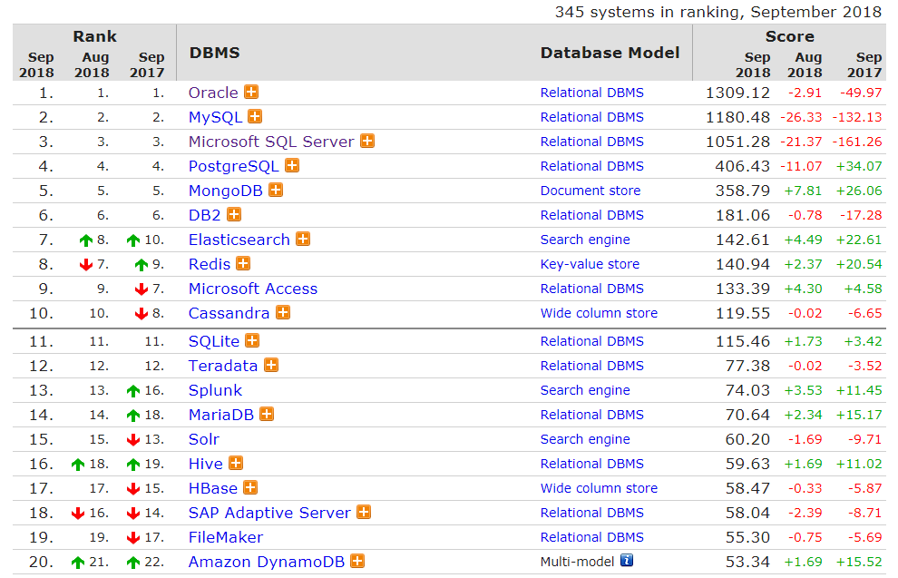 可以看到,分别排名第二和第三的 MySQL 和 Microsoft SQL Server,分数都出现不小的下降(-26.33, -21.37),而且也是整个排行榜中分数下降得最多的两个数据库。而深受欢迎的 PostgreSQL 数据库本月的分数出现了不小的下滑(-11.07),若按此趋势,MongoDB 今年或者有望将 PostgreSQL 挤下第四名的位置。