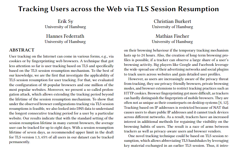 研究显示,即便标准浏览器将 TLS 对话恢复生命周期设置为仅维持一天,用户仍可以被追踪长达8天之久,TLS 1.3 草稿版本建议 TLS 对话恢复生命周期为7天上限,研究人员通过 Alexa 资料集中的至少一个网站,便可永久追踪实验中的 65% 用户。