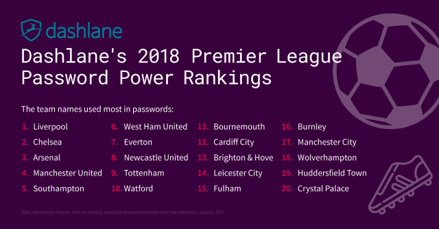 密码管理公司Dashlane的分析显示,随着足球赛季的开始,球队名称经常被用作密码。研究人员使用由弗吉尼亚理工大学计算机科学系助理教授王刚提供的匿名数据库,它专注于国家橄榄球联盟和英超联赛的球队名称。