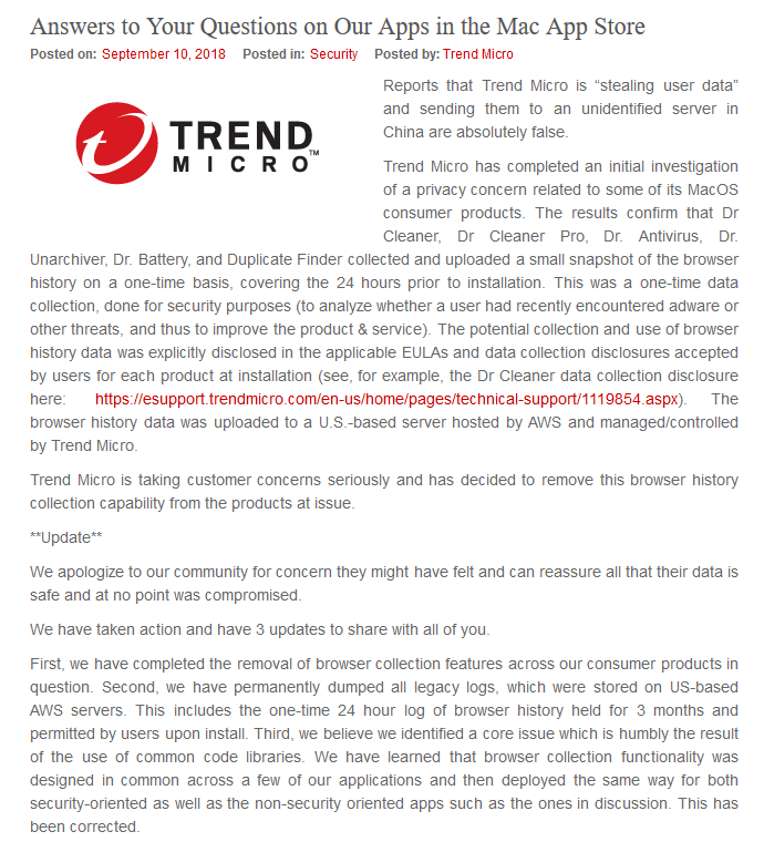 安全公司趋势科技旗下的软件 Dr Cleaner、Dr Cleaner Pro、Dr. Antivirus、Dr. Unarchiver、Dr. Battery 和 Duplicate Finder 被发现会收集用户的浏览历史并上传到其服务器上,苹果已经从其应用商店下架了相关应用。该公司发表声明称它的数据收集是一次性的,只限于安装前的 24 小时。