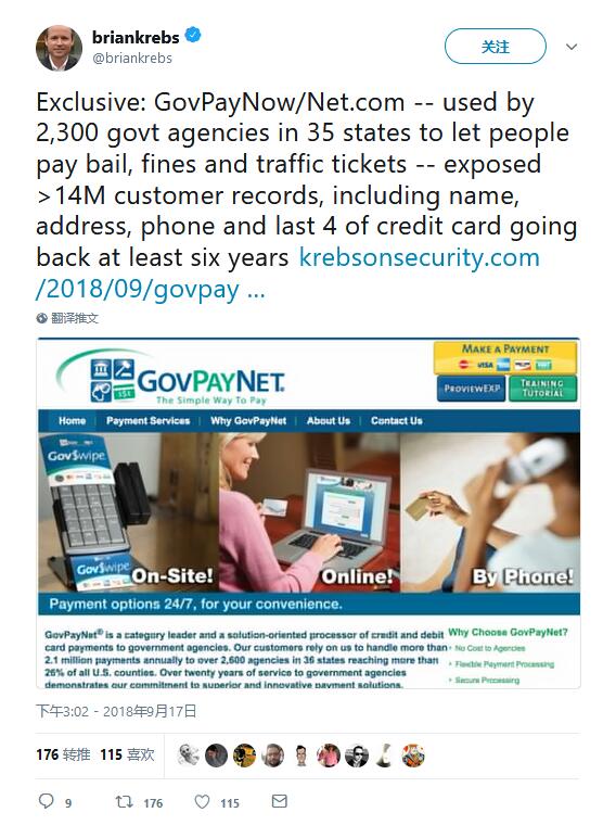 GovPayNet是总部位于美国印第安納波利斯市(Indianapolis)的私营企业,为美国35个州的2300多个美国政府机构提供在线支付服务。根据最新信息,自2012年以来大概有1400万条包含收据信息的记录被泄露。据安全研究员Brian Krebs报道,公司网站GovPayNow.com允许任意人访问收据数据,其中包括法院下达的罚款、保释金以及交通罚款等等。