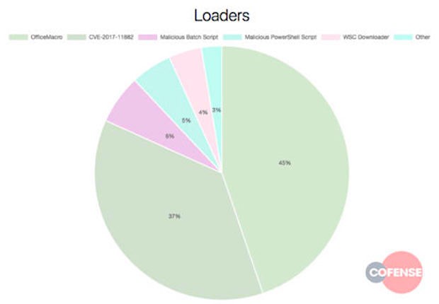 在分析恶意软件在2018年8月期间使用的传递机制时,Cofense Intelligence发现45%的恶意软件有效负载通过微软Office宏发送。恶意软件和攻击倾向于使用微软Office宏作为感染链的第一阶段,并且在大约45%的安全事件中作为传递恶意程序的主要方式。