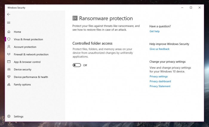 在系统托盘上的Windows Defender Security Center (现叫做Windows Security) 图标会显示Windows 安全警告,并且在打开该应用之后会鼓励用户配置OneDrive,为部分文件创建自动备份以便于防止被勒索。