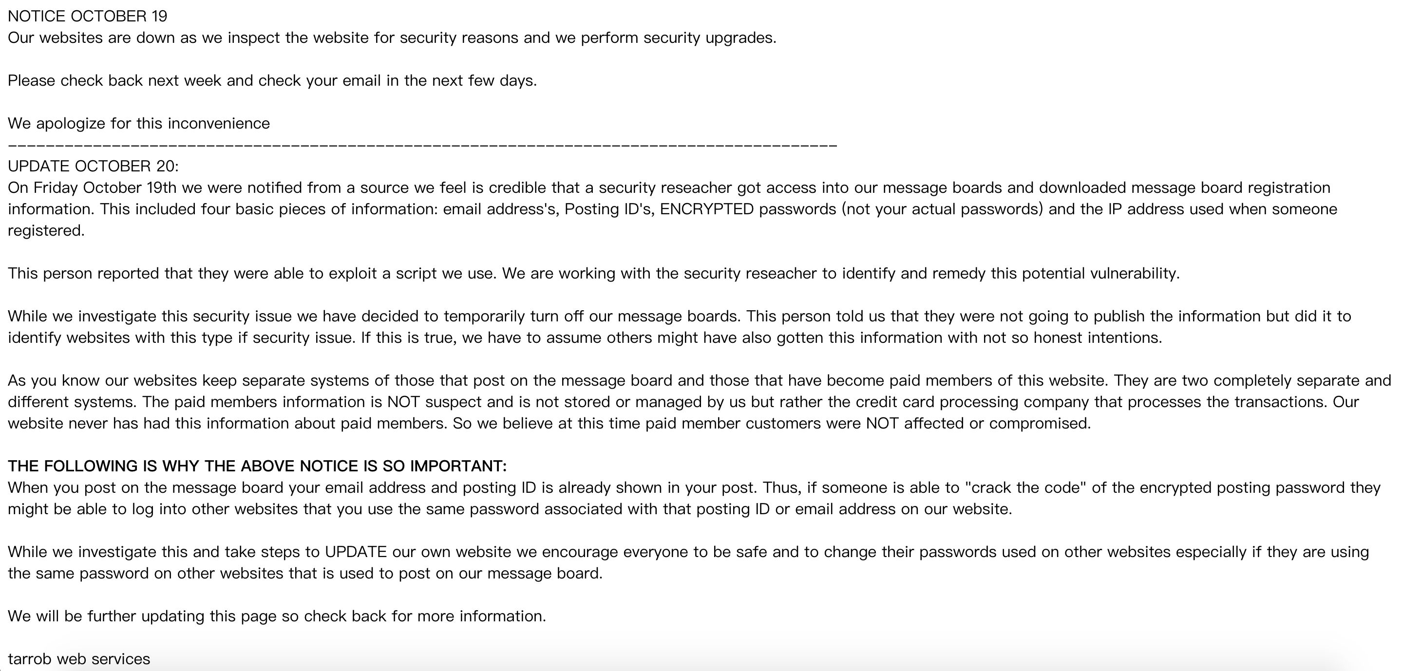 截止笔者发稿之时,这8个网站仍处于关闭状态,全部挂上同一个安全升级公告页面,公开这次数据泄露的详细信息,并建议用户修改自己其它账户密码,尤其是使用与这些网站账户相同密码的用户。