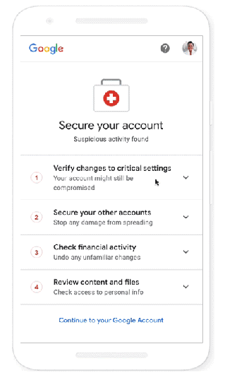 第四项:此项是针对账户被入侵后的恢复环节。它是一个重新获得访问权限并重新保护受损配置文件的新程序,除了帮助用户重新获得帐户访问权限外,还可以帮助他们查看与 Google Pay 帐户相关的财务活动,查看添加到 Gmail 或云端硬盘的新文件,以及保护其它服务的其它帐户与主 Google 帐户绑定的内容。