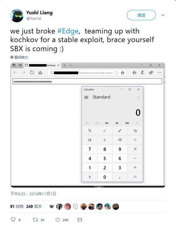 安全研究专家Yushi Liang表示正计划公开Edge浏览器的零日漏洞。该漏洞能够执行远程代码,并能从Edge的沙盒中逃脱。Liang在一则推文中演示了利用该漏洞从网页端打开桌面的计算器应用,推文中写道:“我们刚刚攻破Edge,和kochkov合作找到了这个稳定漏洞,支持自身SBX即将到来。”