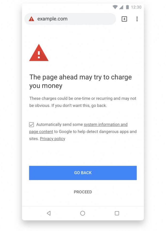在向广告滥用行为说不之后,谷歌决定进一步加强 Chrome 71 的反扣费欺诈功能。在即将推出的 12 月更新中,该浏览器将在用户访问嫌疑网站时放出警告。若某个已知网站使用了阴暗或误导性的结算行为,比如诱骗用户输入手机号码来实施游戏扣费,将会收到 Chrome 给出的红牌警告。