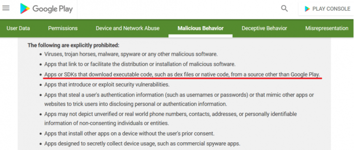 Google Play的政策明文规定禁止移动应用从Play 商店以外的地方下载可执行的程序,但内含flashplayer_update.apk的Simple Call Recorder却照样通过Google审查,而且还安然无恙地待了11个月,直到近日才被Google移除。