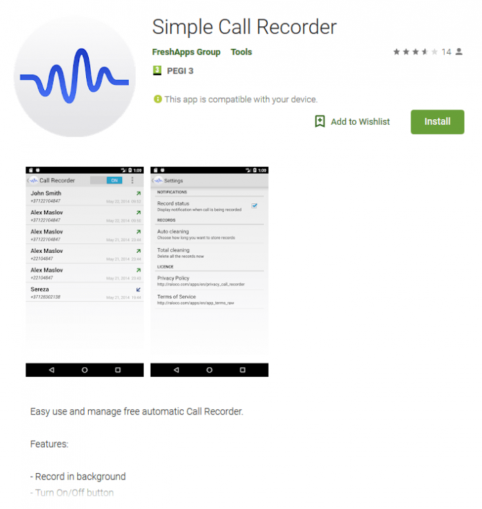 在去年11月底登上Google Play的Simple Call Recorder约有5000次的安装次数,具备完整的电话录音功能,但主要目的却是要求使用者下载及安装一个伪装成Flash Player的更新应用,只是该更新应用实质上为恶意应用。