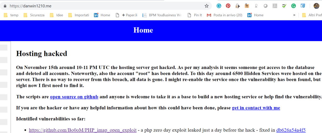 11月15日晚10:06(UTC),黑客使用正确的phpmyadmin和adminer密码登录服务器主机并删除了所有账户,连“root”账户也不例外。然后在10:53(UTC)注入数据库,第二天凌晨0:50左右开始删除所有聊天记录、链接列表和点击计数器相关的数据库。黑客曾在在14号早上5:33使用该账户访问了数据库,日志已经被复写多次,所以利用了哪些漏洞或采取了什么手段目前未能确定。