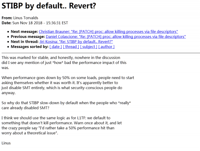 上周五,稳定内核维护者 Greg Kroah-Hartman 释出了 Linux kernel 4.19.4、4.14.83 和 4.9.139,其中 4.19.4 和 4.14.83 主要是撤回 STIBP 补丁。Linus Torvalds 在开发者邮件列表上指出,STIPB 补丁付出的代价比人们以为的更昂贵,当某些负荷的性能下降 50%,那么人们可能就需要扪心自问这个代价是否值得付出。还不如完全禁用超线程的好。当真正关心安全的人已经禁用了超线程那么为什么还要默认启用 STIBP?也许在 STIBP 补丁更可靠之后稳定版内核可能会再次移植代码。