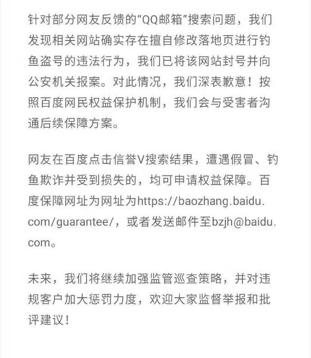 12月1日下午消息,近日,有网友反映在百度搜“QQ邮箱”,结果排名第一的竟然是一个盗号网站。对此,百度官方回应称,发现相关网站确实存在擅自修改落地页进行钓鱼盗号的违法行为,已将该网站封号并报案。
