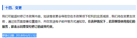 ▲腾讯隐私政策更新日期为2018年6月13日