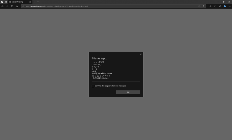 for ( ; ; ) {window.alert(" ∧_∧ ババババ\n( ・ω・)=つ≡つ\n(っ ≡つ=つ\n`/ )\n(ノΠU\n何回閉じても無駄ですよ~ww\nm9(^Д^)プギャー!!\n byソル (@0_Infinity_)")}