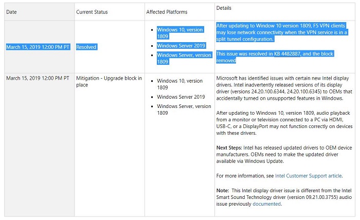 微软解释称,在更新到 Window 10 Verizon 1809 之后,当服务启用了拆分隧道配置时,F5 虚拟专用网客户端可能会失去网络连接。现在,该问题已在 KB4482887 中得到解决,原先的升级屏蔽措施也已被解除。