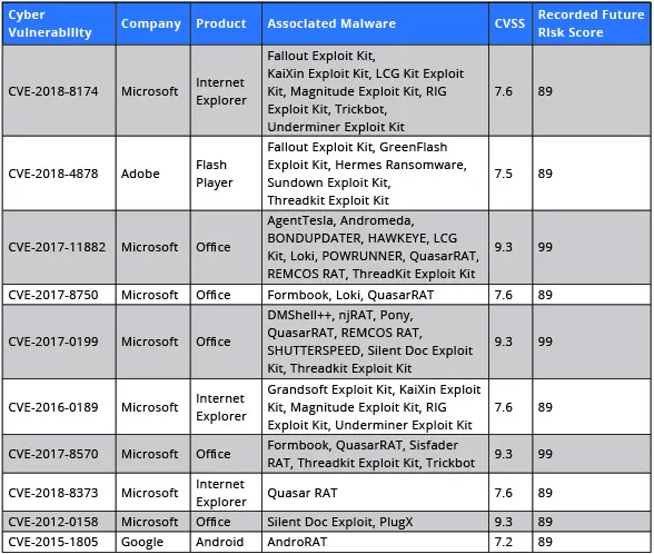 该名单由 Recorded Future 分析了大量资料后制作。在参考了深网(deep web)论坛帖子、代码仓库和暗网等资料之后,Recorded Future 将漏洞利用工具包、网络钓鱼和远程访问木马(RAT)进行的网络攻击列入了该名单的范围。