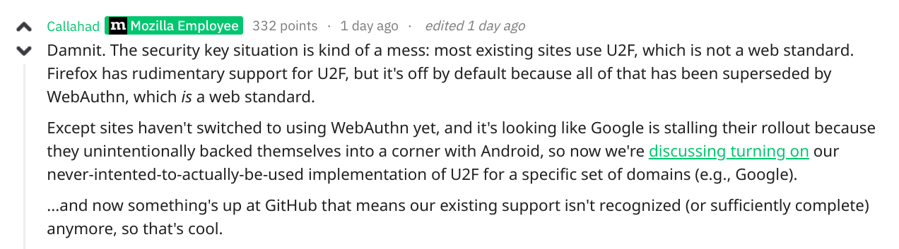 reddit 原帖:https://www.reddit.com/r/firefox/comments/b39eac/github_no_longer_allows_using_security_keys