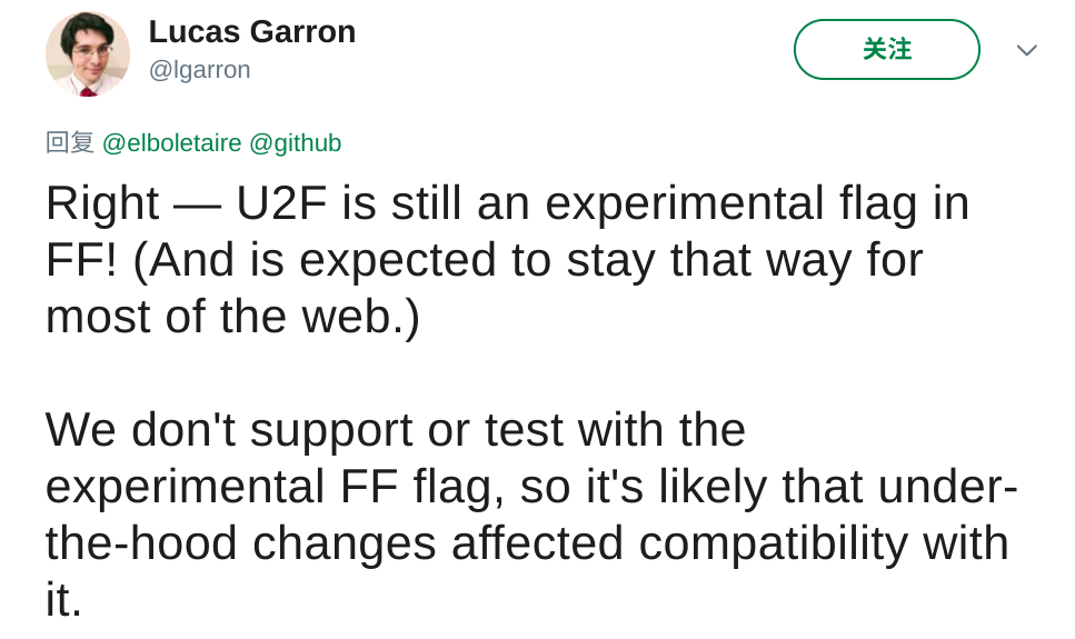 而另一边,Twitter 上一位 GitHub 工程师也回应了这个问题,他则表示目前 GitHub 着力于 WebAuthn,并且 U2F 还是 Firefox 的实验性功能,GitHub 不会测试或支持 Firefox 的实验性功能,之所以会出现在 Firefox 上无法使用 U2F 登录的问题,可能是因为对 WebAuthn 的某些更改影响了其兼容性。