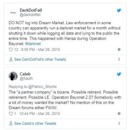 Dream Market 是目前最大的暗网市场之一,它宣布关闭的时机在用户中间引发了怀疑:即 Dream Market 可能早就被执法机关扣押了,目前只是把它作为蜜罐运营。