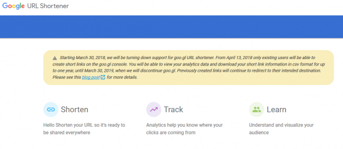 根据https://goo.gl/网站所显示的信息,自2018年3月30日开始谷歌开始逐渐关闭goo.gl URL短网址服务。在2018年4月13日之后只允许现有用户继续使用短链接生成服务,另外还能查看他们的分析数据以及以CSV的格式下载短链接信息。而在2019年3月30日,goo.gl控制台将正式关闭。